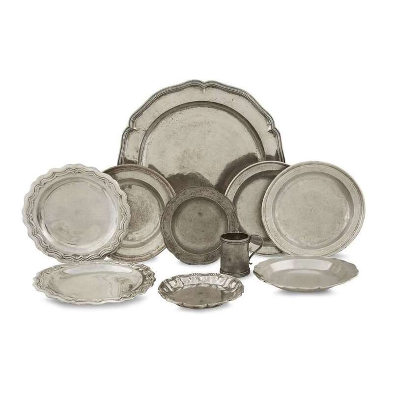 Group of ten Spanish Colonial silver and pewter chargers, dishes and mug Central or South American, late 18th century