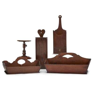 Comprising two cutlery trays, a pipe box, a candle box with heart-shaped handle, and a turned adjustable candlestick stand.