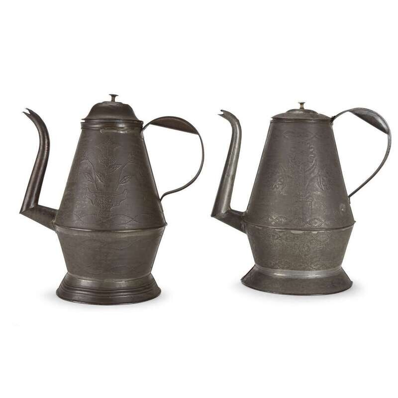 Two punch-decorated tin coffeepots One marked "M. Uebele" on handle, Pennsylvania, 19th century