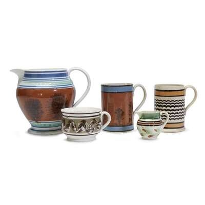Group of five variously decorated Mochaware items English, early 19th century