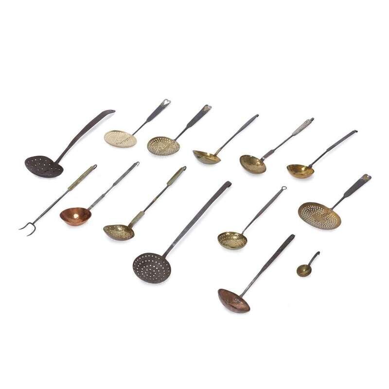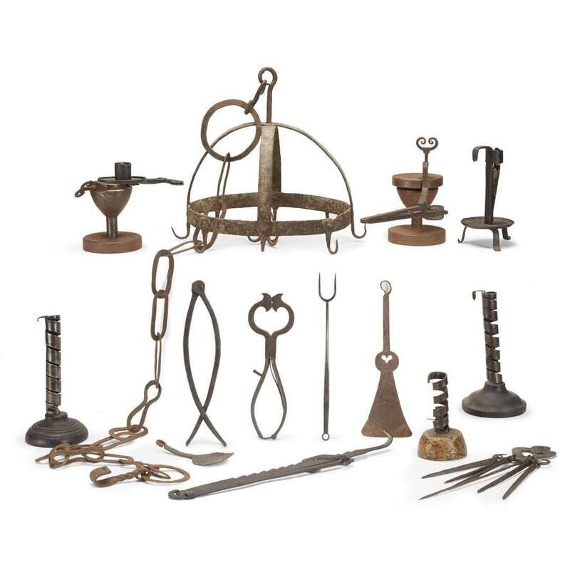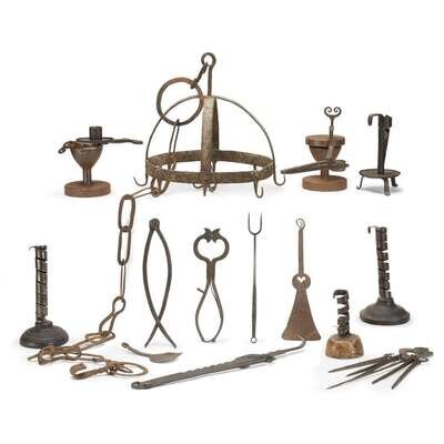 Comprising three iron and wood and one iron courting candlesticks; two adjustable and articulated iron candlesticks; a small copper oil can; thirteen wrought iron, brass, and copper spoons and ladles, many perforated; a wrought iron pot rack and chain; a wrought iron fork, spoon, spatula, and two pot holders; a wrought iron extending hook; and six wrought iron skewers on a wall hook.