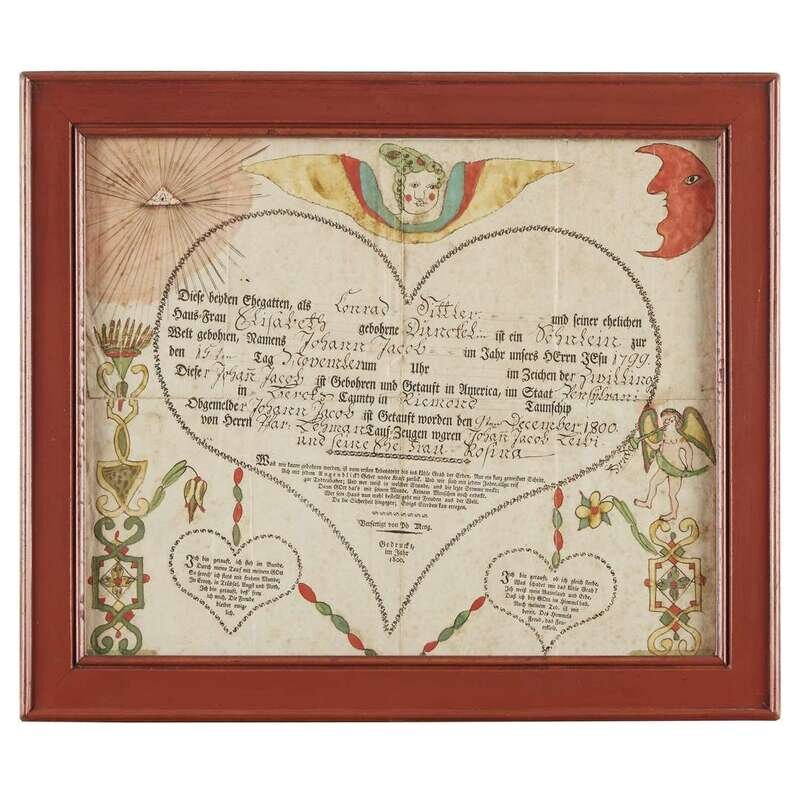 Attributed to Johann Jacob Friederich Krebs (1749-1815) Fraktur: birth and baptismal record for Johann Jacob of Richmond, Berks County, PA, dated "1800"