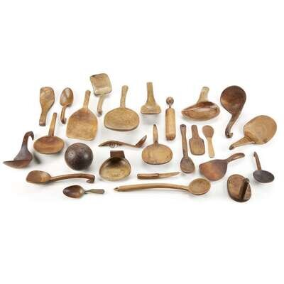 Collection of twenty-four carved and burlwood spoons, ladles, and kitchen implements Most 19th century