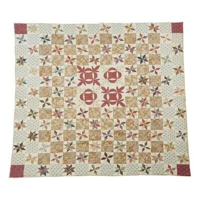 Comprised of printed cotton fabrics arranged in alternating squares, some with appliqued stars centering four large squares appliqued in variation of 'Turkey Track' pattern, heightened with diamond quilting.
