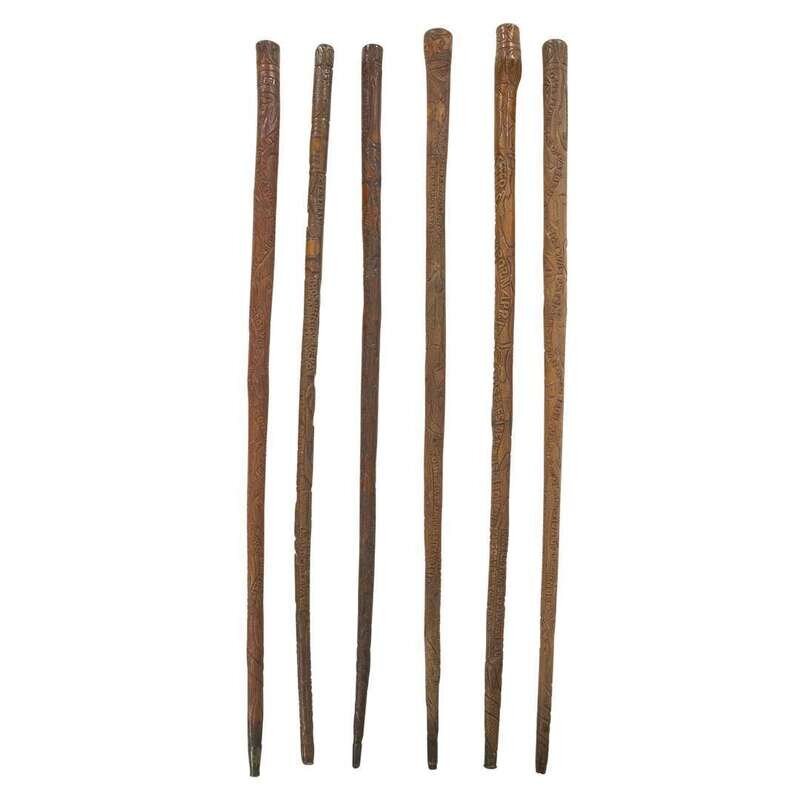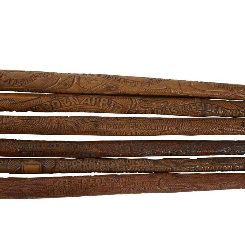 Group of six carved wood Thomas Jefferson canes or walking sticks Thomas Jefferson Craddock (1845-1918), Albemarle County, VA, circa 1870-1900