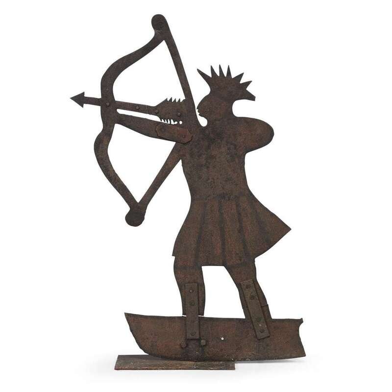 Painted sheet iron silhouette weathervane of an Indian with bow and arrow late 19th century