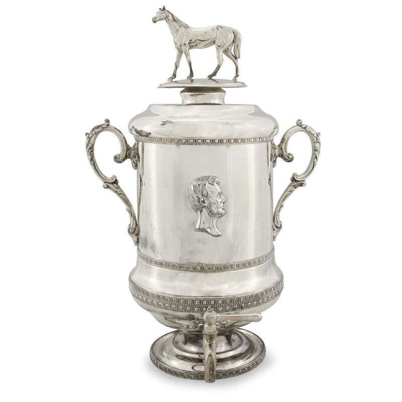 The twin-handled urn with egg and dart banding and applied profile portrait of Abraham Lincoln (President, 1861-1865), the lid surmounted by a horse, possibly a representation of Lincoln's horse Old Bob (c. 1849-?).