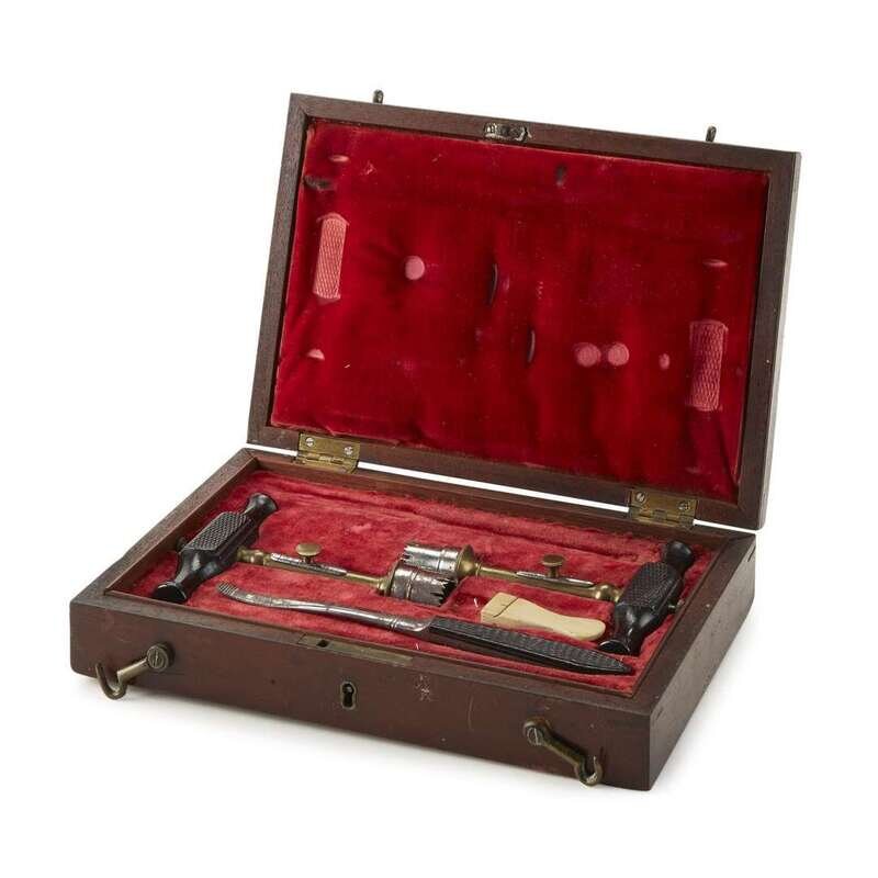 Velvet-lined, with brass pull; includes four trepanning implements.