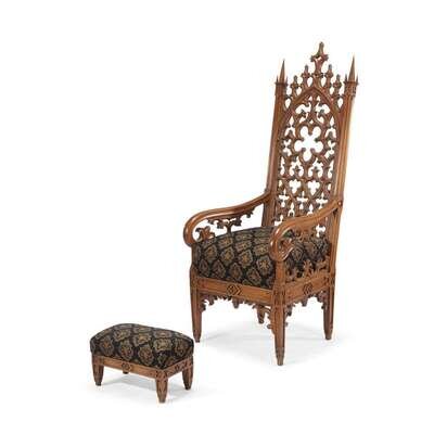 Impressive Gothic Revival walnut armchair and footstool Signed "Robert Lowry, Westchester, PA 1838"