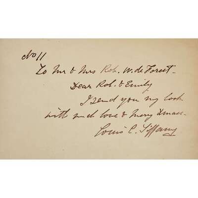 First and limited edition, number 11 of 492 copies. Signed and inscribed by Tiffany in ink on first free endpaper, "No 11/ To Mr and Mrs Rob. W. de Forest-/ Dear Rob & Emily/ I send you my book/ with much love & many thanks/ Louis C. Tiffany." Illustrated with 20 mounted color plates and 42 photogravures, as called for in the List of Illustrations; each with captioned tissue guard.