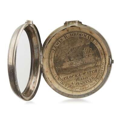 With sterling silver case, marked with indistinct English hallmark, and having paper label to interior "Lewis R. Broomall Clock & Watch Maker & Jeweller No. 110 N. 2nd St. 2nd door bel. Race Philada", the brass watch works engraved with profile portrait of Benjamin Franklin and inscribed "Franklin"; the works also inscribed "A Hollisone Liverpool"; the silver back cover with sterling silver hallmarks for Vale & Co., Birmingham, England, 1819-1822.