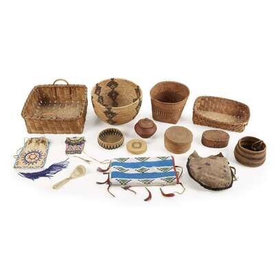 Comprising ten baskets, some Northeastern Woodlands; four beadwork bags: medicine bag, small strikalight bag, pouch with horsehair tassels and reused beadwork, and another pouch; and a carved bone spoon with incised lines and reindeer motif, possibly Canadian.