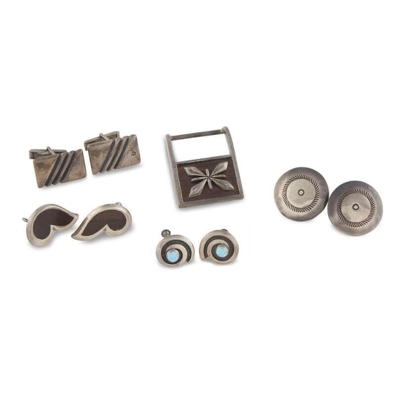 Comprising three pairs of earrings, one pair mounted with turquoise and another pair inlaid with wood; a belt buckle inlaid with wood; and a pair of cufflinks; all marked.