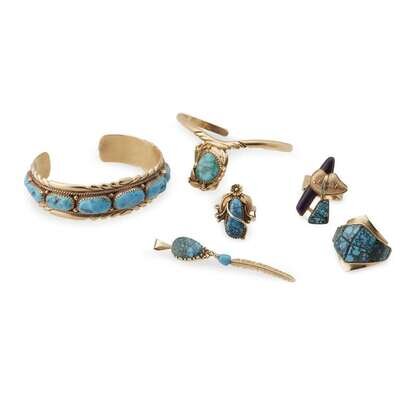 Including a ring by Don Juan, signed "Don Juan New Mexico"; a 14 karat gold ring by Andy Lee Kirk (1947-2001), signed "Kirk"; a 14 karat gold ring with bear stone motif, signed "STT" and marked "14K"; a 14 karat gold bracelet by Robert and Bernice Leekya, marked "RLB" and "14K"; and a 14 karat gold bracelet bt George Kee, signed "G. Kee" and marked "14K"; and a hanging feather pendant by Richard Tsosie, marked "Tsosie".