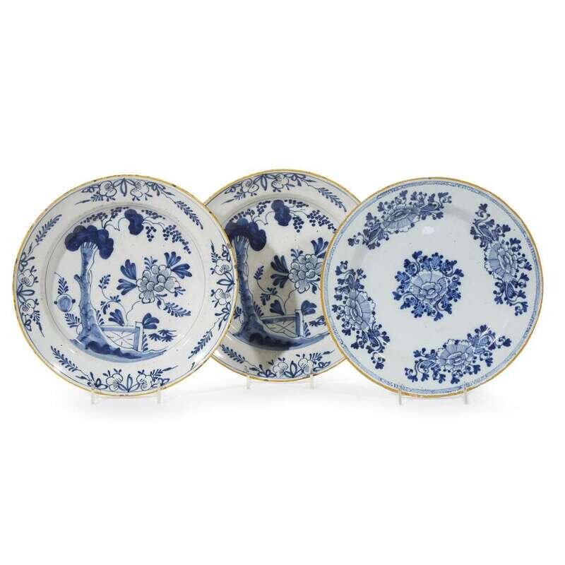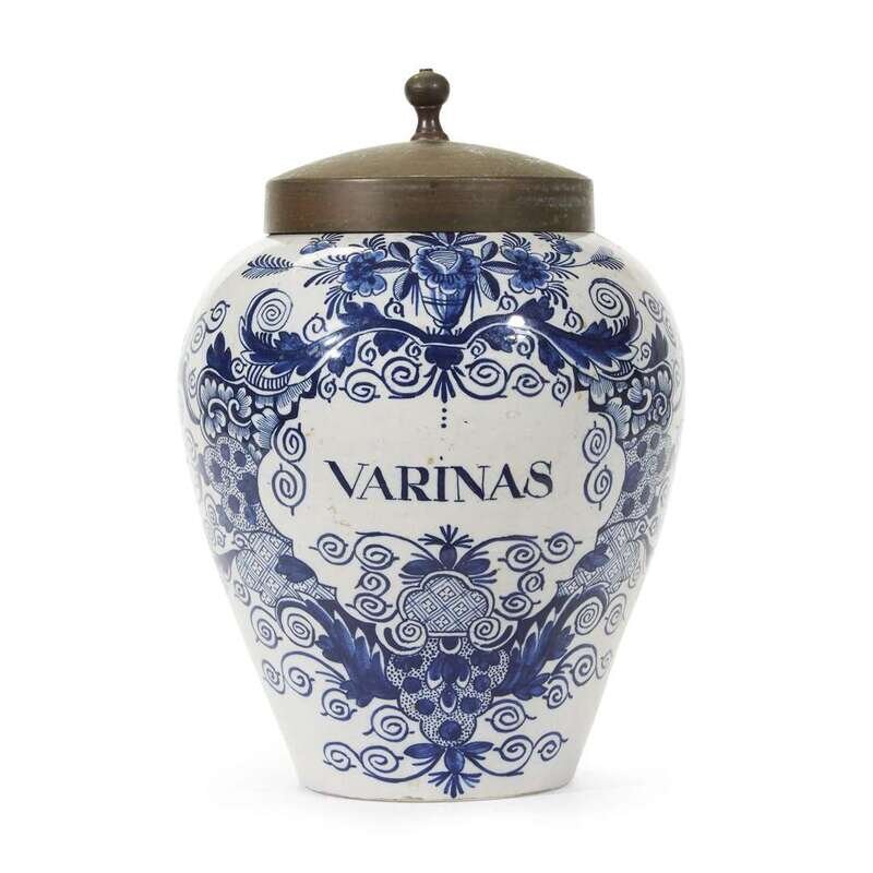 Dutch Delft "Varinas" tobacco jar and three Delft Chargers 18th century