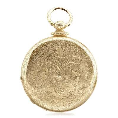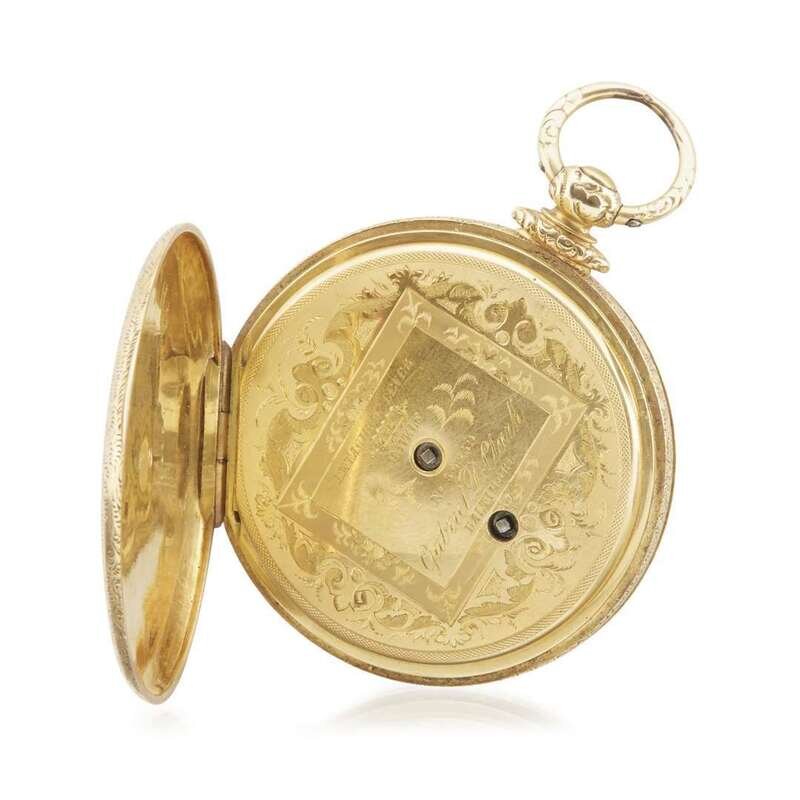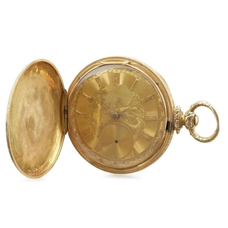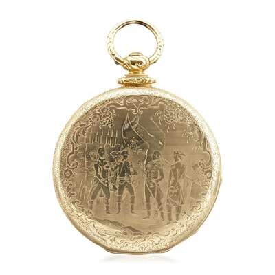 The front cover engraved with Revolutionary War scene; the back cover engraved with floral motifs; the interior face engraved with waterside town scene; the back side of works inscribed "Detached Lever/13 Jewels/Gabriel D. Clark Baltimore"; marked "JB" to interior of back cover.