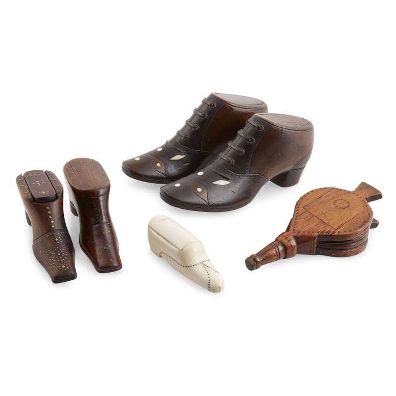 Group of five carved wood, ivory, and brass-inlaid snuff boxes English, late 18th/early 19th century