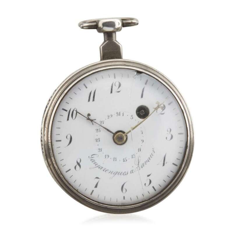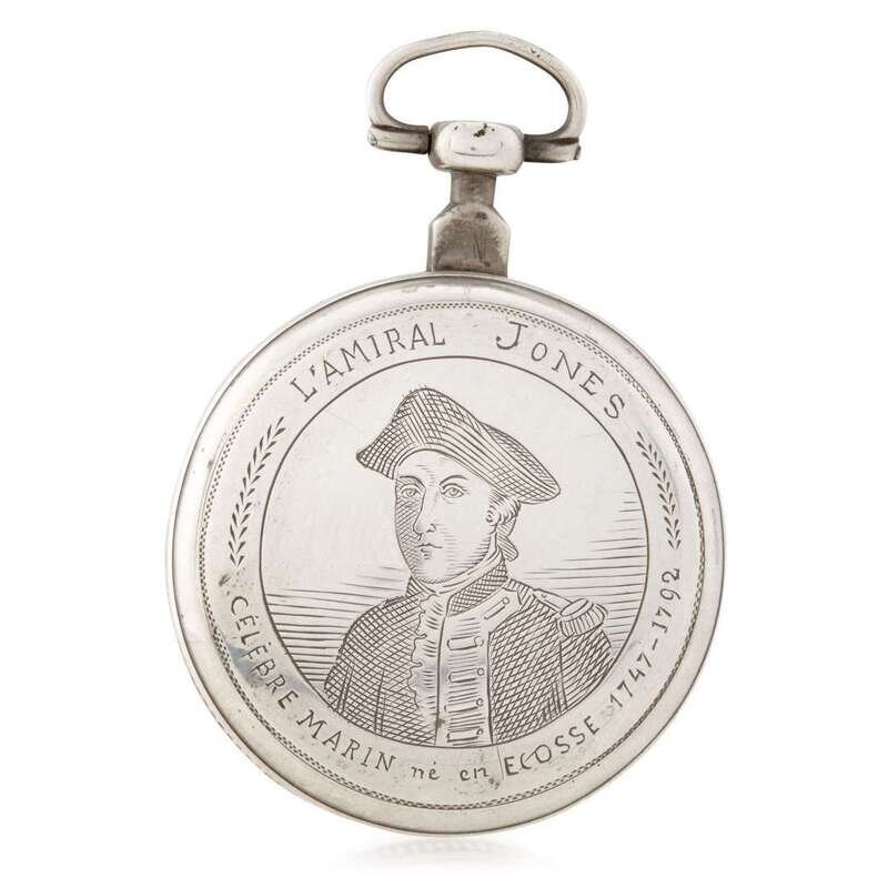White enamel face inscribed "Gaiyarenques a Lavaur"; the back cover engraved with a portrait of Admiral John Paul Jones and inscribed "L'Admiral Jones/Celebre Marin ne en Ecosse 1747-1792"; the reverse of works engraved "Gaiyarenques a Lavaur."