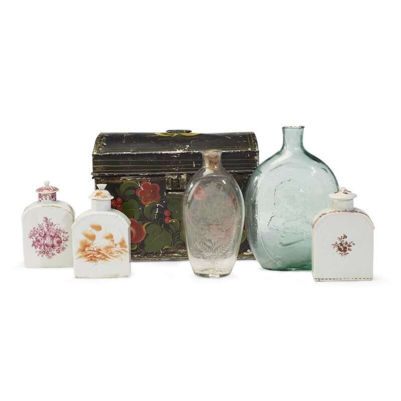 Comprising three Chinese Export porcelain tea caddies with floral motifs and scenic view, 18th century; a G1-51 molded glass Washington Taylor flask, Dyottville Glass Works, Philadelphia, PA, 19th century; a blown and etched glass flask with bird and monogram "FS" above floral motif to one side, and date "1790" with floral motifs to other side; and a toleware document box with floral motifs, early 19th century.