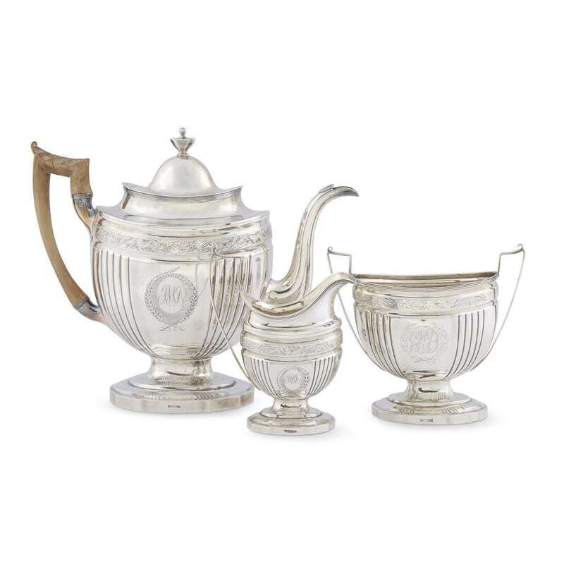 Urn-form, with reeded bodies and band of engraved foliage motifs and laurel cartouche bearing monograms: teapot and creamer inscribed "JMJ" and sugar bowl inscribed "JED".