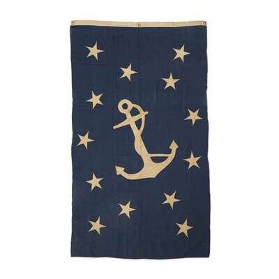 Two-part wool bunting field with a double appliqued cotton fouled anchor enclosed by machine-sewn, double appliqued cotton stars arranged in an oval formation with a single star in each corner, canvas hoist with three brass grommets, inscribed, "Dahlgren Association Flag," and "C. H. Leaman, Paymaster."
