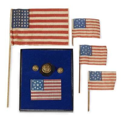 Comprised of four 13-Star American parade Flags printed in medallion pattern, three with poles; one 36-Star American parade Flag with pole; and three G.A.R buttons.