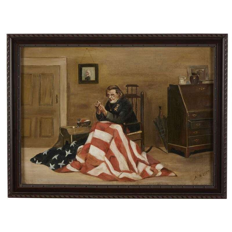 American School 19th century Civil War Veteran Wearing his G.A.R. Insignia Mending a Flag