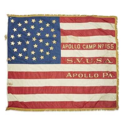 Gold-painted stars arranged in a triple wreath or medallion centering a single star and enclosed by 4 corner stars on a silk canton, machine-sewn stripes, painted, "Apollo Camp No. 155 / S.V.U.S.A / Apollo PA," gold fringe, retains five ribbon ties at hoist.