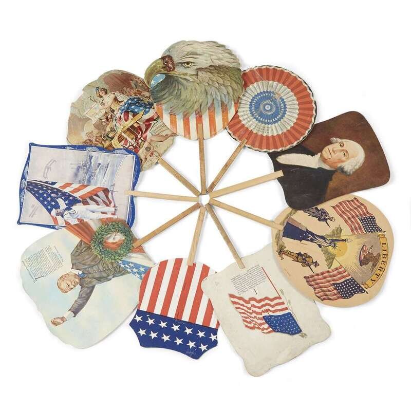 Variously printed on cardboard with Presidents, American Flags, American Eagle, Liberty, and American service men, all with wooden handles and all stamped, "Mastai Collection."