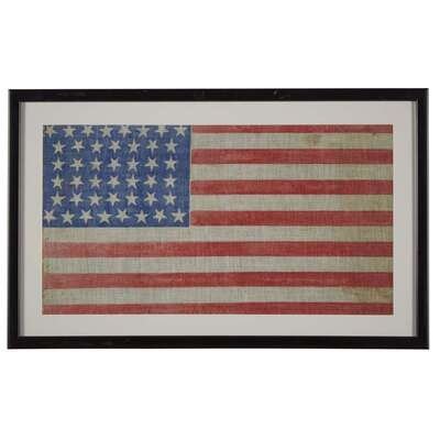 Printed on cotton, the stars arranged in rows of 8,7,7,7,7,8 arcing at both ends of canton, mounted and framed.