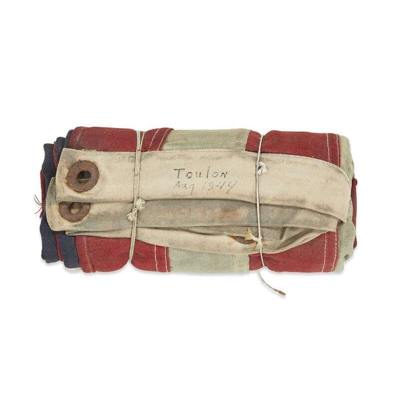 The rolled machine-sewn cotton flag, with canvas hoist fitted on grommets, hand-inscribed, "Toulon Aug. 1944," retains original string binding.