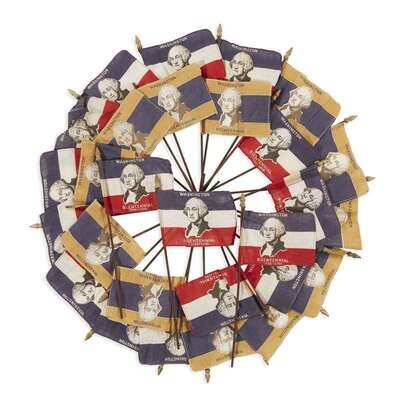 Comprising twelve printed with gold, white, and blue stripes, and sixteen printed with red, white and blue stripes all centering a portrait of George Washington.