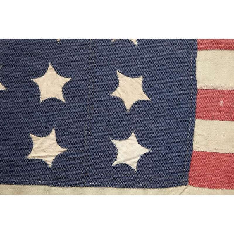 Hand-sewn, single appliqued cotton stars arranged in 4 rows of 6, on a three-part wool bunting canton, the stars are unusual in that they "peek" through to the front, hand-sewn stripes, canvas hoist retains hemp rope, two hand-sewn grommets, mounted and framed.