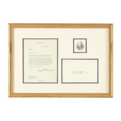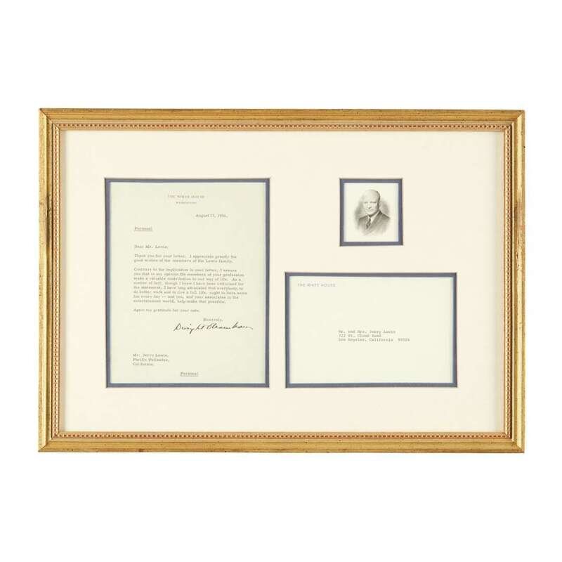 The White House, Washington D.C., August 17, 1956. 1 p. 4to. On White House stationery, with original envelope. To comedian Jerry Lewis: "Dear Mr. Lewis: Thank you for your letter. I appreciate greatly the good wishes of the members of the Lewis family. Contrary to the implication in your letter, I assure you that in my opinion the members of your profession make a valuable contribution to our way of life. As a matter of fact, I have long advocated that everybody, to do better work and to live a full life, ought to have some fun every day -- and you, and your associates in the entertainment world, help make that possible. Again my gratitude for your note. Sincerely, Dwight D. Eisenhower." Framed with an engraved portrait of Eisenhower, unexamined out of frame.
