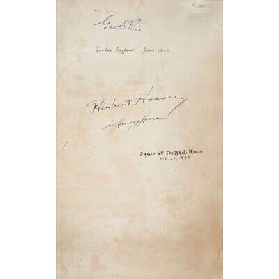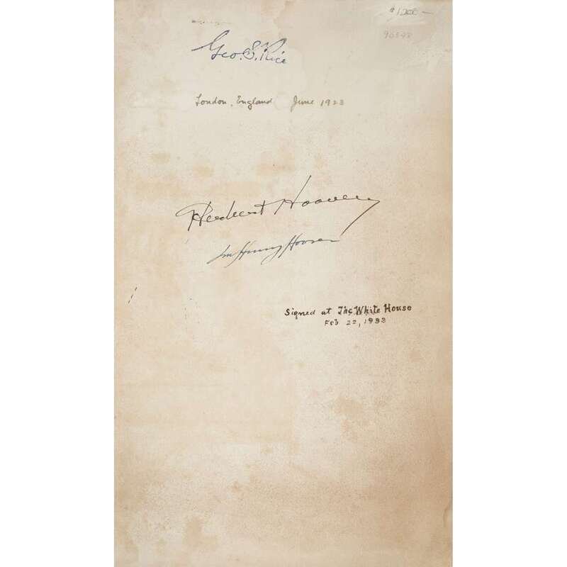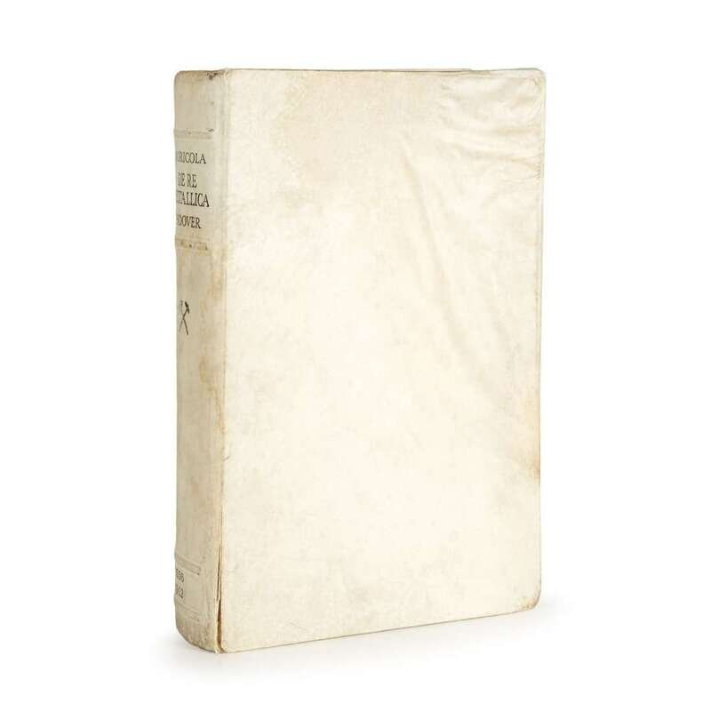 London: The Mining Magazine, 1912. Translated into English from the first Latin edition of 1556 by Hoover and his wife, Lou Henry Hoover, and signed by them on front free endpaper, annotated: "Signed at The White House/ Feb 22, 1933." Folio. Illustrated with numerous full page and in-text illustrations reproducing the original 1556 woodcuts. Publisher's full vellum binding, spotted and partly affected by damp; dampstaining to top right of title-page and corresponding sections of first several leaves; other scattered dampstaining; some scattered darkening.