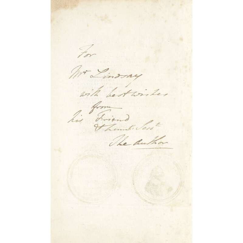 (London): John Abraham, (1785). First edition. 8vo. (9), vii, 206 pp. Presentation copy: "For/Mr. Lindsay/with best wishes/from/his friend...the author" on title-page verso. Original boards, worn and rubbed, old repairs along front and rear joints, spine lacking, joints split but bands holding, ownership signature on front board; title-page soiled, bottom corner of p. 97/98 torn away and crudely repaired; dampstaining in top corner of text throughout entire volume, creasing and closed tears to fore-edge; in blue linen-covered fall-down-back box.