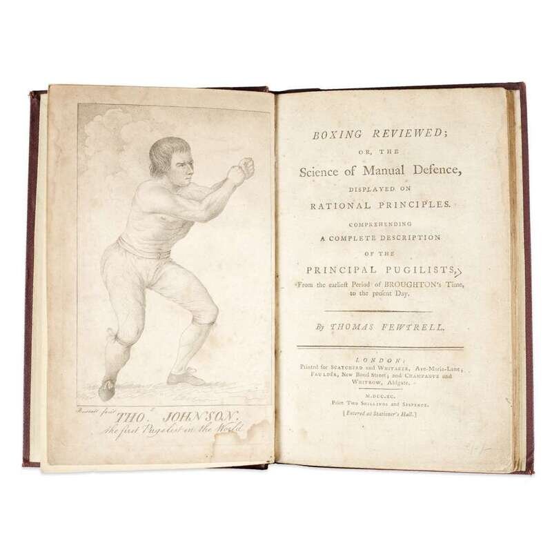 ... to the present Day London: for Scatcherd and Whitaker, et al.,1790. First edition. 8vo. (i)-xi, [1], (1)-88 pp. Includes a discussion of Daniel Mendoza, "Universally known as a teacher of the science and a Boxer..." Illustrated with an engraved frontispiece portrait of Thomas Johnson, "the first Pugilist in the World in action." Bound in 20th-century quarter maroon calf over purple cloth-covered boards, minor wear, spine ends lightly rubbed; frontispiece with discrete paper reinforcement, moderate toning and some dampstaining; some toning and offsetting on title-page; other minor marginal dampstaining and scattered soiling at front. ESTC N62554; Hartley, 664.