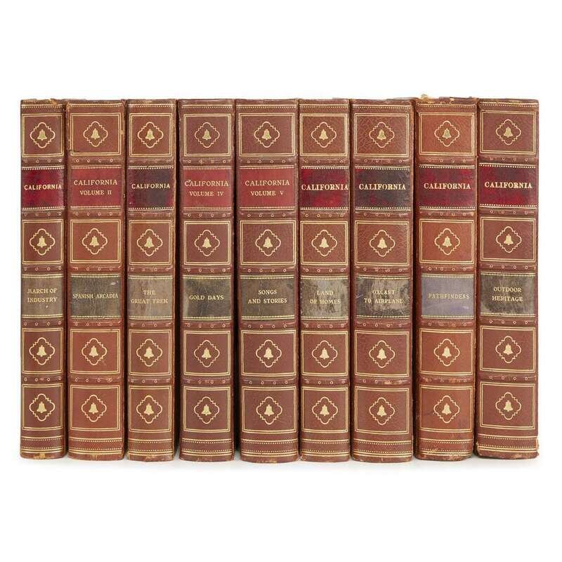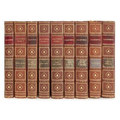 Los Angeles: Powell Publishing Company, (1928-1929). In nine volumes. De Luxe edition of 387 sets, this set with three volumes numbered (361) and including subscriber's name, the other six volumes unnumbered and without subscriber's name. Tall 8vo. Includes numerous autographs from California pioneers, including members of the Donner Party, engineer George Chaffey, many "Covered Wagon Babies" (children born on the trail to California in 1848, 1849, and in the 1850s), and many others. Illustrated with numerous wood engravings and maps. Contemporary full brown morocco, stamped in gilt with illustrations of California grizzly bears and mission bells, joints rubbed, some spine ends chipped, some spine labels replaced, some sunned; boards of fourth volume slightly bowed; top edges gilt, other edges untrimmed; marbled endpapers; text and plates very gently toned. A very good set.