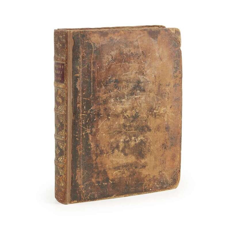 ... through the Country from Pekin to Canton.... London: for T. Cadell and W. Davies, 1806. Second edition. 4to. Contemporary calf, rubbed and worn, rebacked in early 20th-century cloth with original spine and morocco spine label laid down. Illustrated with color frontispiece and seven sheets of plates (four colored and three in black and white; two folding); "Chinese artillery and Chinese Musical Instruments" misbound between pp. 8/9; light to moderate foxing to text and plates. Tooley 84; Abbey Travels 531.