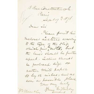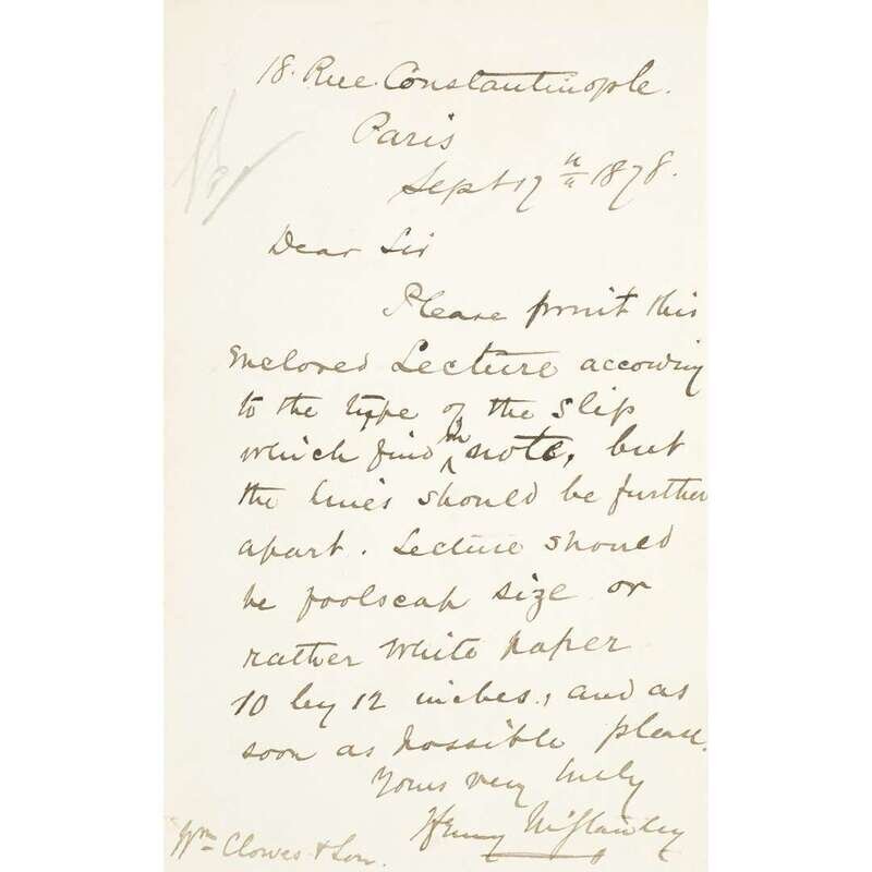Paris, September 17, 1878. 1 p. 12mo. Addressed to the British printing firm William Clowes & Son: "Please print this enclosed lecture according to the type of the slip...but the lines should be further apart. Lecture should be foolscap size or rather white paper 10 by 12 inches, and as soon as possible please." Contents and signature clear and strong.