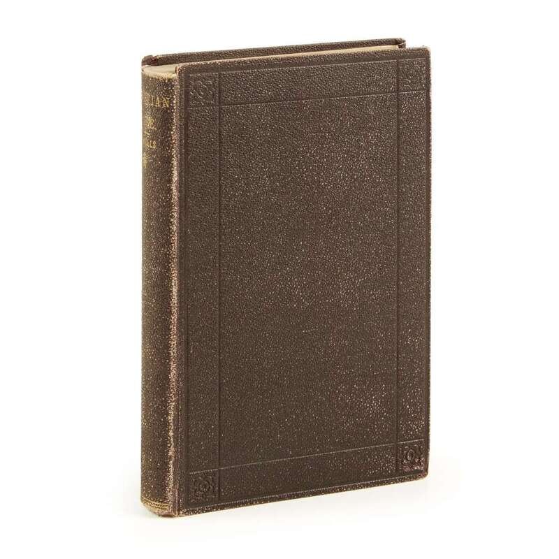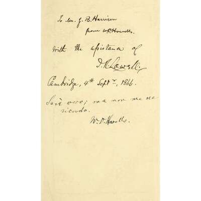 New York: Hurd & Houghton, 1866. First American edition. 8vo. Presentation copy, inscribed on front free endpaper by James Russell Lowell: "To J.B. Harrison/from W.D. Howells./With the assistance of/J.R. Lowell/Cambridge, 4th Sept, 1866" and with an additional inscription below by Howells: "Sa vero; ma non me ne/ricordo./W.D. Howells". Including several marginal manuscript annotations presumably by Harrison. Publisher's full purple cloth-covered boards, stamped in blind and in gilt, spine ends chipped, boards lightly rubbed; all edges trimmed; pale yellow endpapers; text lightly toned. BAL 9547.