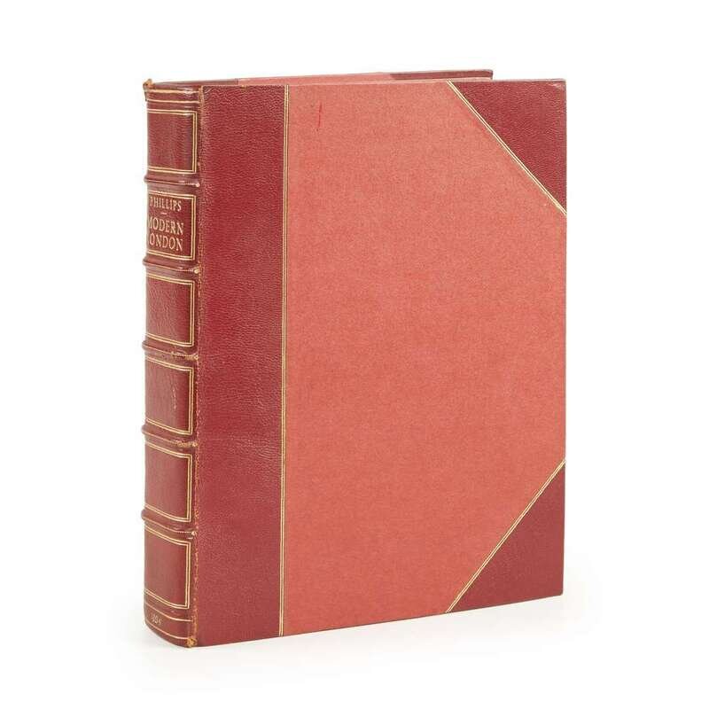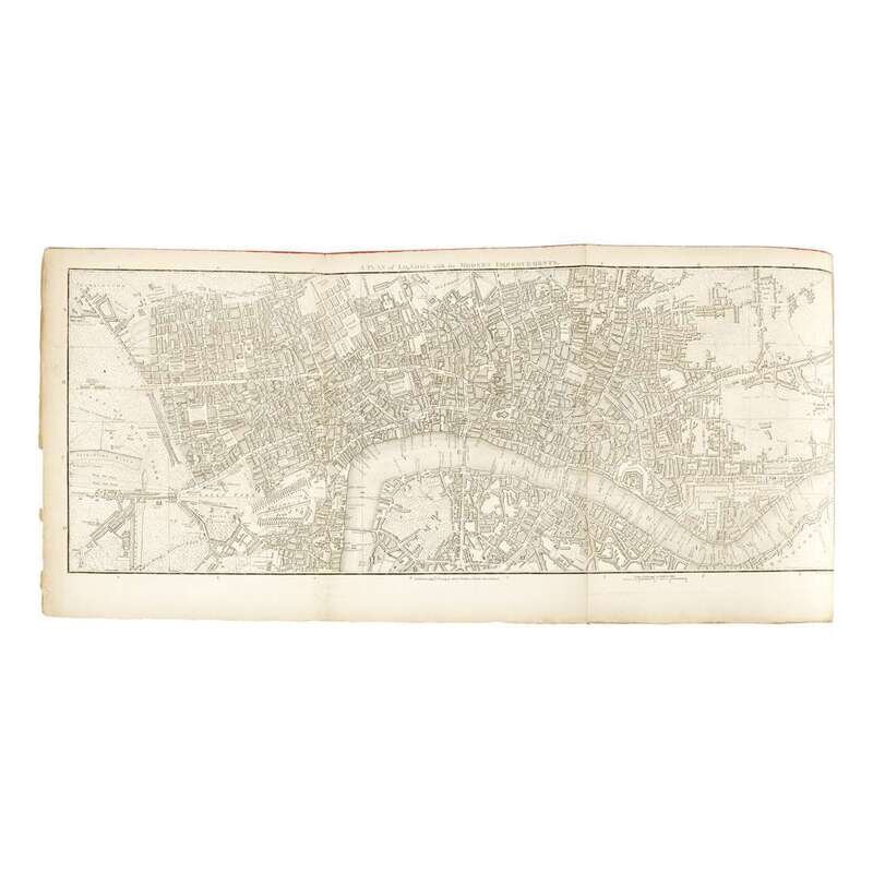 London: Printed for Richard Phillips, 1804. First edition. 4to. Illustrated with folding frontispiece, folding plan of London, 20/21 plates (lacking plate 16, St. Paul's Cathedral, at p. 308), and 31 first-issue hand-colored plates in rear of the Itinerant Traders of London. Sometime 20th century three-quarter red morocco, stamped in gilt, over crimson paper-covered boards, joints lightly rubbed; top edge stained red, other edges untrimmed; frontispiece and title-page toned and foxed; two repairs to frontispiece; descriptive leaf for plate 29 at rear bound upside down; text leaves toned; scattered foxing to same. Tooley 370.