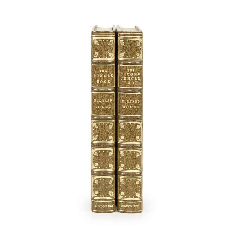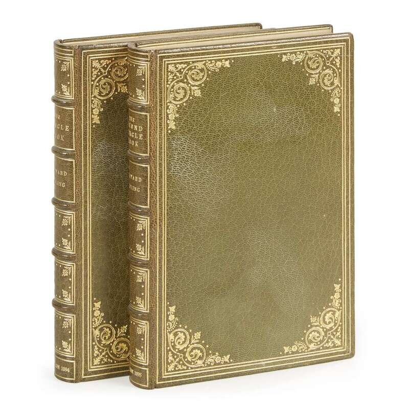 The Jungle Book London: Macmillan, 1894. First edition, second printing. Illustrated by J.L. Kipling, et al. Illustrated with frontispiece, full-page plates and in-text illustrations. Contemporary crushed olive morocco, decoratively stamped in gilt; all edges gilt, gilt filet turn ins; original gilt pictorial cloth covers and spines bound in; all edges trimmed; by Atelier Bindery. With: The Second Jungle Book London: Macmillan, 1895. First edition, second printing. Illustrated by J.L. Kipling. Bound as above; some light smudging to bound-in original front cloth cover; contemporary ownership signature on a front blank.