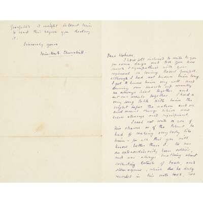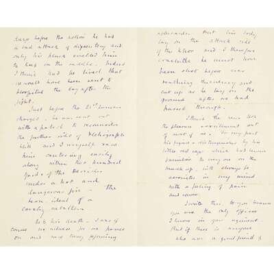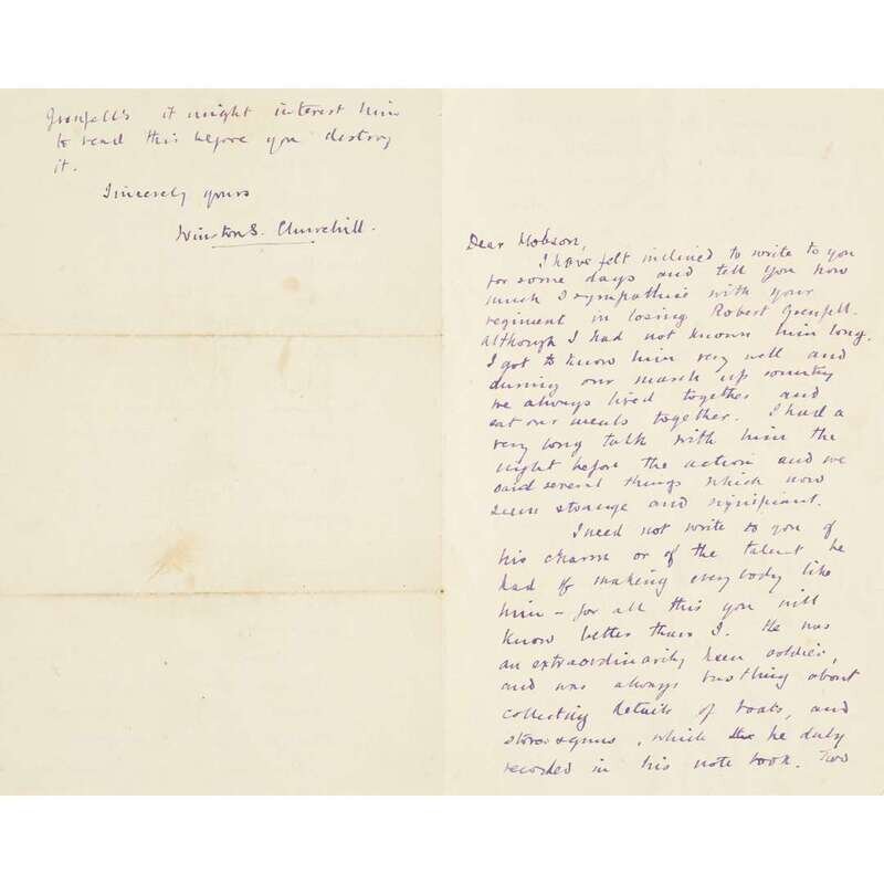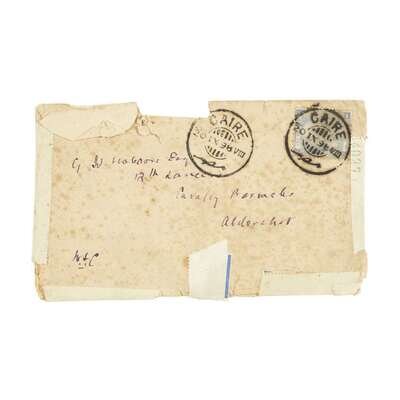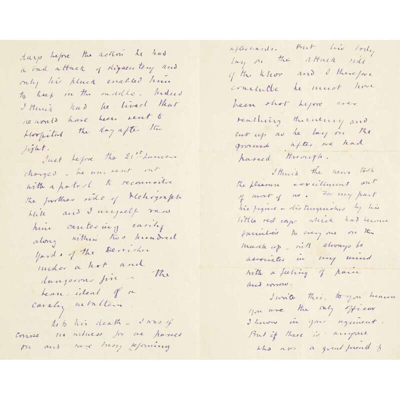 Cairo, September, 1898. One sheet folded in half creating 4 pp.. Folded 8vo sheet, with original hand-addressed postal envelope. To G.W. Hobson of the 12th Lancers in Aldershot [England]: "I have felt inclined to write for some days and tell you how much I sympathise with your regiment in losing Robert Grenfell. Although I had not known him long, I got to know him very well during our march up country we always lived together and ate our meals together. I had a very long talk with him the night before the action...He was an extraordinarily keen soldier, and was always bustling about collecting details of boats and stores & guns, which he duly recorded in his note book. Two days before the action he had a bad attack of dysentery and only his pluck enabled him to keep in the saddle...I myself saw him cantering easily along within two hundred yards of the Dervishes under a hot and dangerous fire-the beau-ideal of a cavalry subaltern. As to his death-I was of course no witness for we passed on and were busy reforming afterwards. But his body lay on the attack side of the Khor and I therefore conclude he must have been shot before ever reaching the enemy and cut up as he lay on the ground...I think the news took the pleasure & excitement out of most of us. For my part his figure...will always be associated in my mind with a feeling of pain and sorrow. I write this to you because you are the only officer I know in your regiment. But if there is anyone who was a great friend of Grenfell's it might interest him to read this before you destroy it." Light horizontal creases along old folds, with two separations, but with no loss to contents; some light wrinkling and minor spotting.