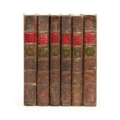 St. Petersbourg: A. Pluchart, 1815. In six volumes. First edition. 8vo. First volume lacking half title-page. Illustrated with 11 folding charts. Contemporary full mottled calf, stamped in gilt, armorial crest of The Society of Writers to the Signet on front and rear boards of each volume, red and green morocco spine labels, rebacked, spines dry, worn, and blistered, joints rubbed, corners worn, extremities rubbed; red stained edges; bottom corner of pp. 51/52 repaired in sixth volume; light spotting in each volume; label on front paste-down in each volume. [Goldsmiths 21113]; [Kress B.6591].