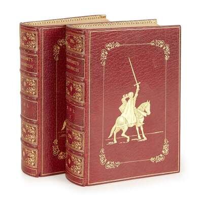 London: Henry G. Bohn, 1855. In two volumes. Thick 8vo. xlvii, 768 pp.; xiv, 733 pp. Translated from the French editions by Thomas Johnes. Extra-illustrated with 73 hand-colored lithographic plates from the Froissart MS in the British Museum. Beautifully bound in full red levant, elaborately gilt; all edges gilt; dentelles in gilt; marbled endpapers; by Bayntun Riviere. A sharp set.