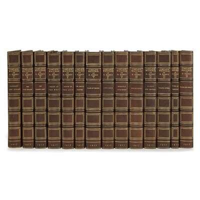 Garden City: Doubleday, Page and Company, 1917. In 14 volumes. #327 of 1,075 numbered sets of the Memorial Edition, Edition de Luxe, signed by illustrator Gordon Grant on frontispiece in first volume as well as publisher Doubleday, Page and Co. on engraved half-title in same. 8vo. Each volume illustrated with a frontispiece and numerous plates by Grant. Three-quarter brown morocco over brown linen-covered boards, stamped in gilt, with slight chipping to some spine ends; top edges gilt, other edges untrimmed; rear hinge of first volume starting. A near-fine set.