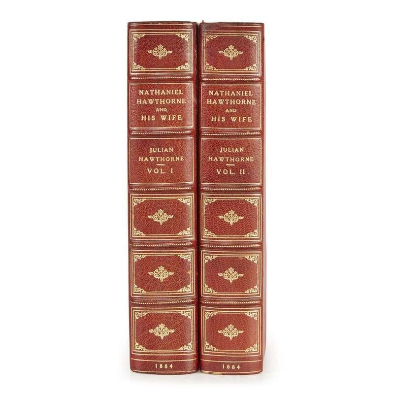 Cambridge, (Massachusetts): Printed at the University Press, 1884. In two volumes. First edition, #320 of 350 numbered sets. 8vo. With two autograph letters, signed by Julian Hawthorne, mounted to first free leaf in each volume. Illustrated with engraved frontispiece portraits, title-page vignettes, and four engraved portrait plates. Contemporary three-quarter red morocco, stamped in gilt, over red linen-covered boards; top edges gilt, other edges untrimmed; marbled endpapers. A handsome set.