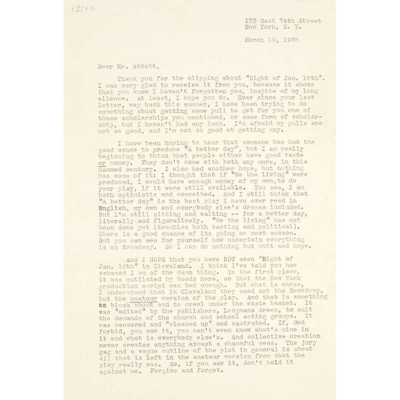 New York, March 19, 1938. 2 pp. 4to. To theatrical producer George Abbott. Light to moderate horizontal creases along old folds. In green cloth chemise with dark green morocco cover label.