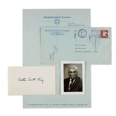 Martin Luther King Sr. signed photograph. 3 x 2.5 in. (76 x 63 mm). With original blank stationary leaf from the Ebenezer Baptist Church (Atlanta, GA) and original postal envelope, dated Jan. 20, 1982. Numerous manuscript scrawls in pen from a different hand on envelope. With: Coretta Scott King autograph. On 3 x 5 in. (76 x 127 mm) card.